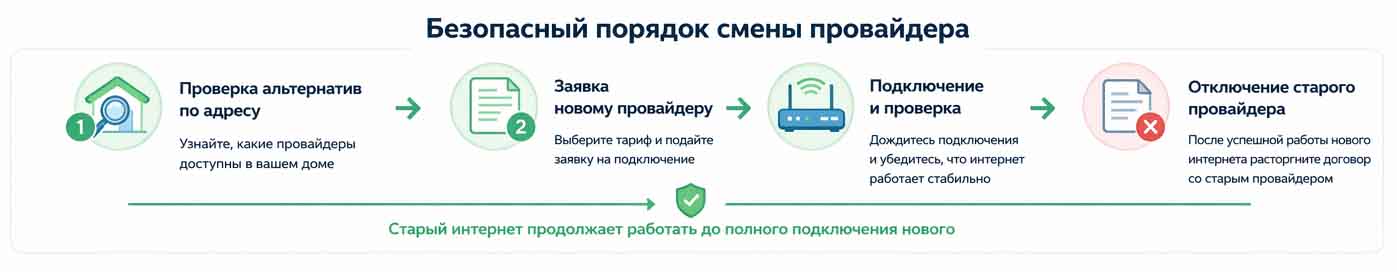 Это главный смысловой блок всей статьи. Правильная последовательность выглядит так: сначала проверить альтернативы и адрес, затем выбрать нового оператора и подать заявку, потом дождаться подключения и проверить работу новой линии, и только после этого завершать отношения со старым провайдером.